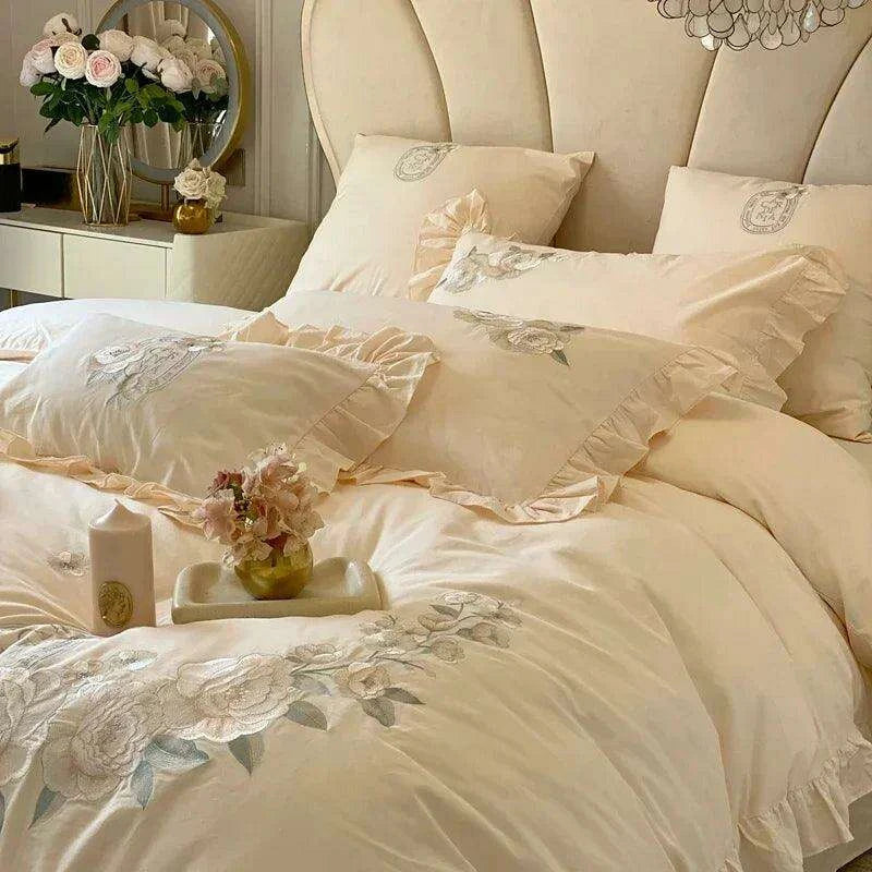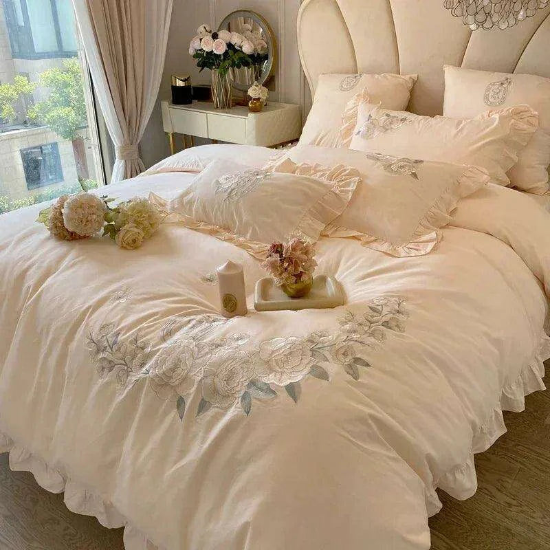 100% Cotton French Ruffle Embroidered Autumn-Winter Bedding Set includes a duvet cover, bed sheet, and pillowcases crafted from pure cotton for natural softness and year-round comfort.