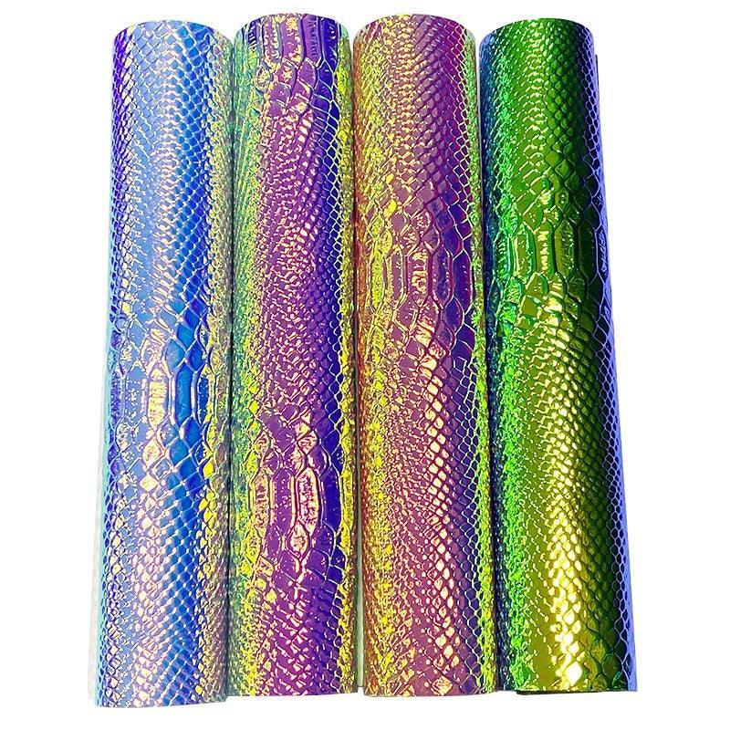 Our Iridescent Holographic Snake Skin Embossed Faux Leather Sheet is not only striking in appearance but also offers unmatched quality. Unlike competitors, our product is designed for crafters who demand elegance and durability, making it the perfect choice for both personal and professional projects.