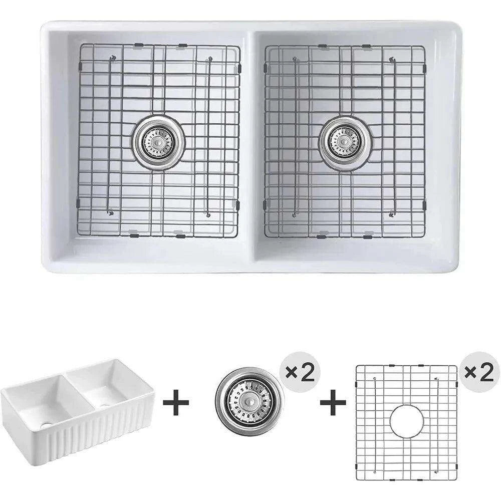 33-Inch Stylish Double Bowl Fireclay Farmhouse Sink with Reversible Apron Front by HausinLuck - Elegant White Design