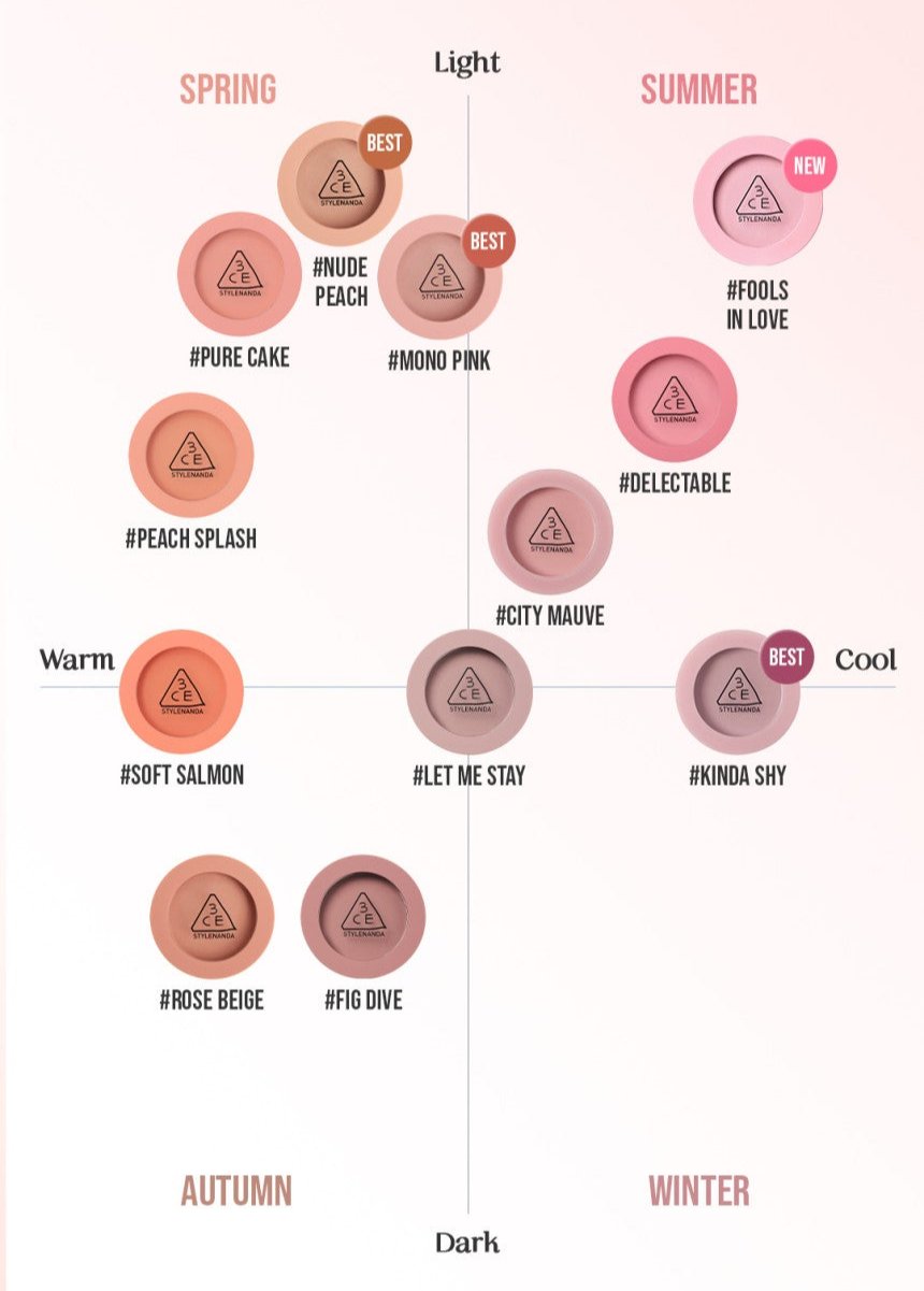 3CE Face Blush Powder Long Lasting Soft Focus Cheek Color absorbs sweat and excess sebum for a long-lasting cheek look with a soft-focus finish. The cult-favorite powder blush delivers wearable color that looks natural and real, not flat or chalky.