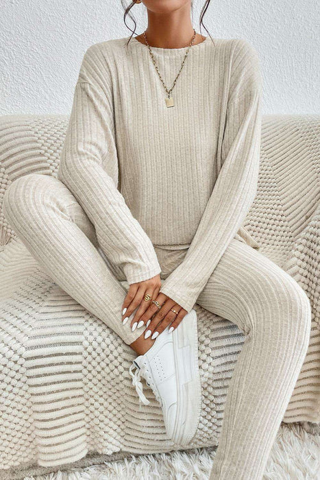 Chic Apricot Ribbed Knit Lounge Ensemble: Long Sleeve Top & Slim Fit Pants