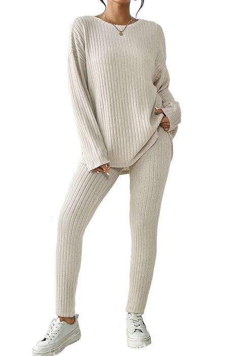 Cozy Apricot Ribbed Knit Two-Piece Lounge Set: Long Sleeve Top & Fitted Pants