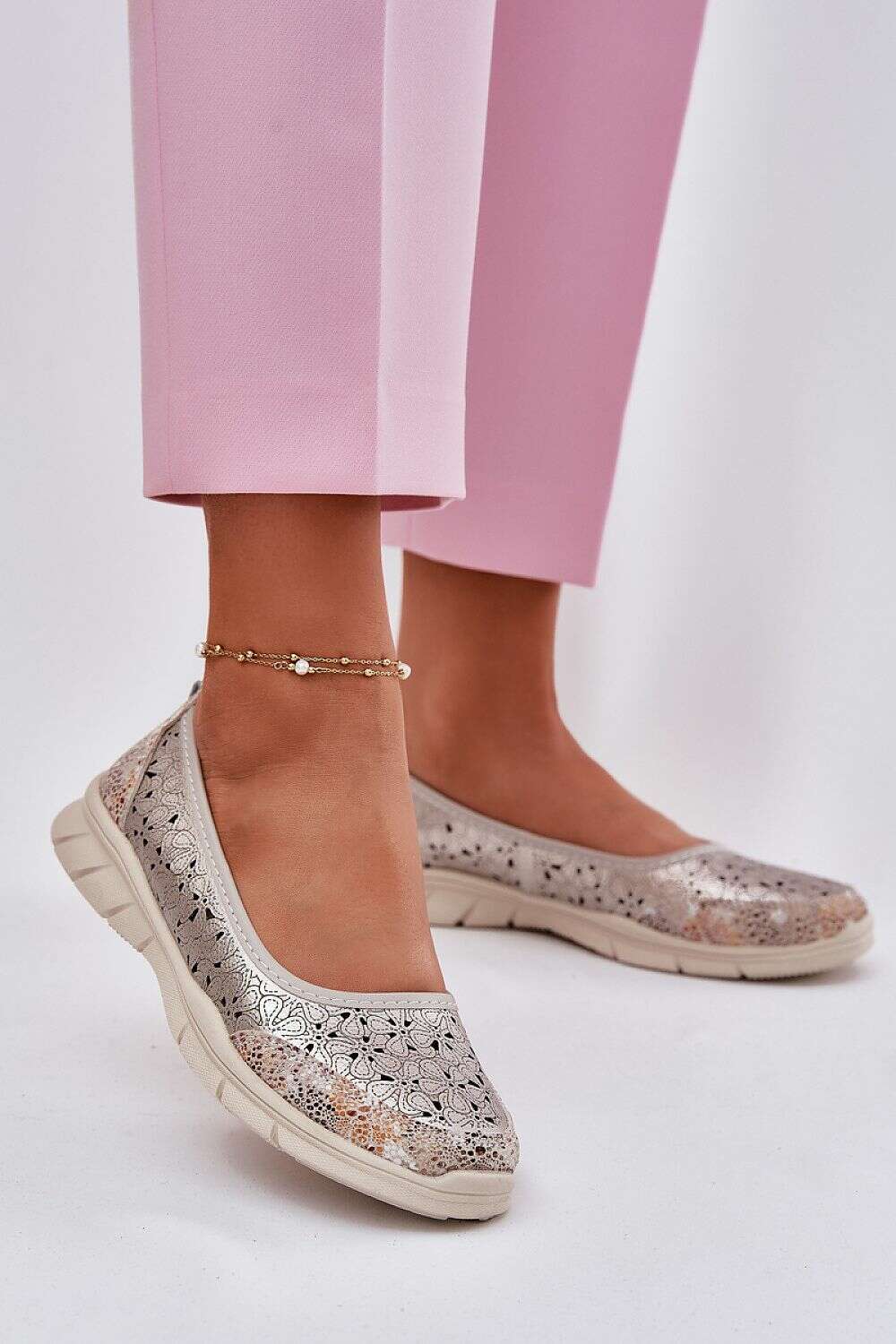 Women's ballerina flats made of natural leather are a combination of elegance and comfort. The model stands out with a lightweight construction and a subtle cut-out pattern, which gives them lightness and originality. Rounded toes provide comfort while the soft insole ensures comfort throughout the day. These ballerina flats will be a perfect choice for everyday wear, perfectly complementing summer outfits.