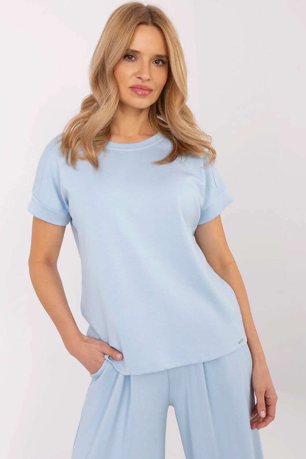 Casual everyday blouse with a classic, universal cut. Made of a blend of viscose, polyester, and elastane, which ensures softness, breathability, and comfort when worn. The smooth material makes it easy to match to different stylizations. A model of standard length, with short sleeves and a round neckline that emphasizes the natural shape of the neck. Excellent for everyday wear, it pairs well with both pants and skirts, creating comfortable yet stylish outfits.
