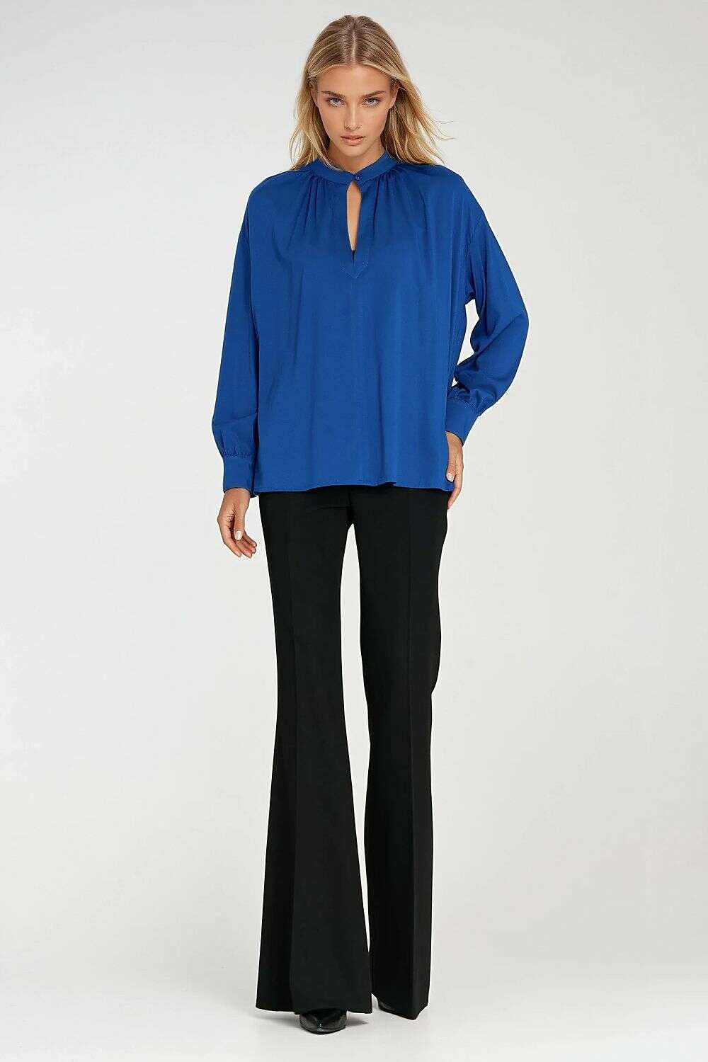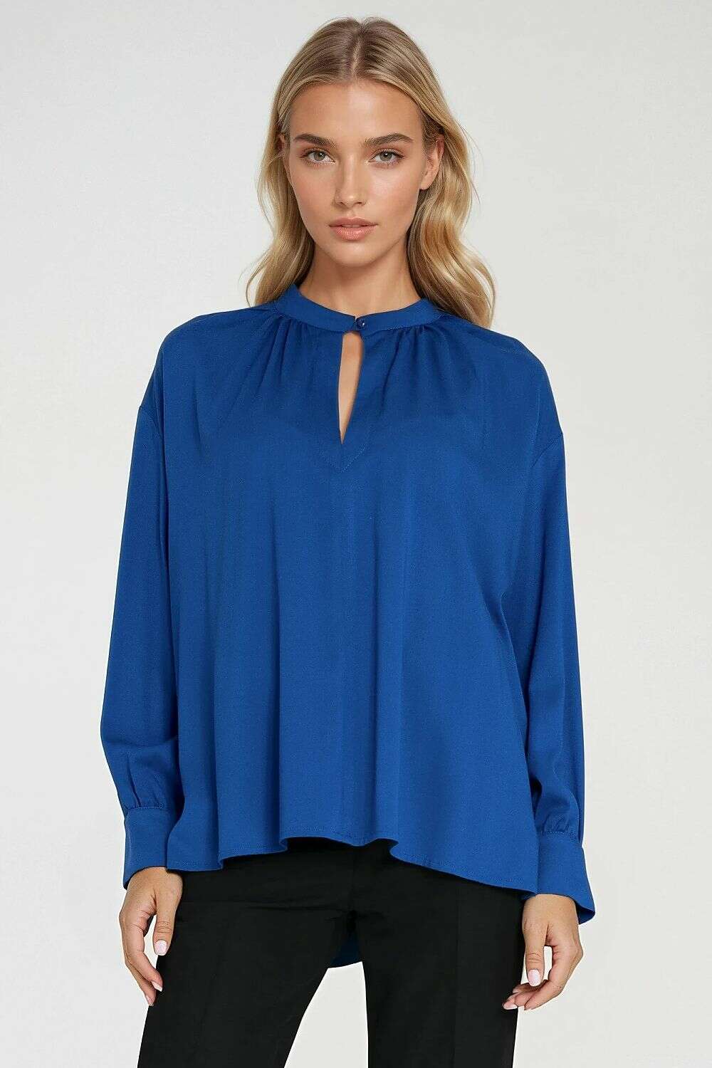 Designed with a roomy oversized cut, this blouse is made from lightweight, soft viscose for all-day comfort. The teardrop neckline closes with a subtle button, drawing attention to the neck while staying refined. Long sleeves end in delicate cuffs, and ruching at the neckline and cuffs adds a touch of movement and elegance. A flexible model that transitions effortlessly from office to casual wear.