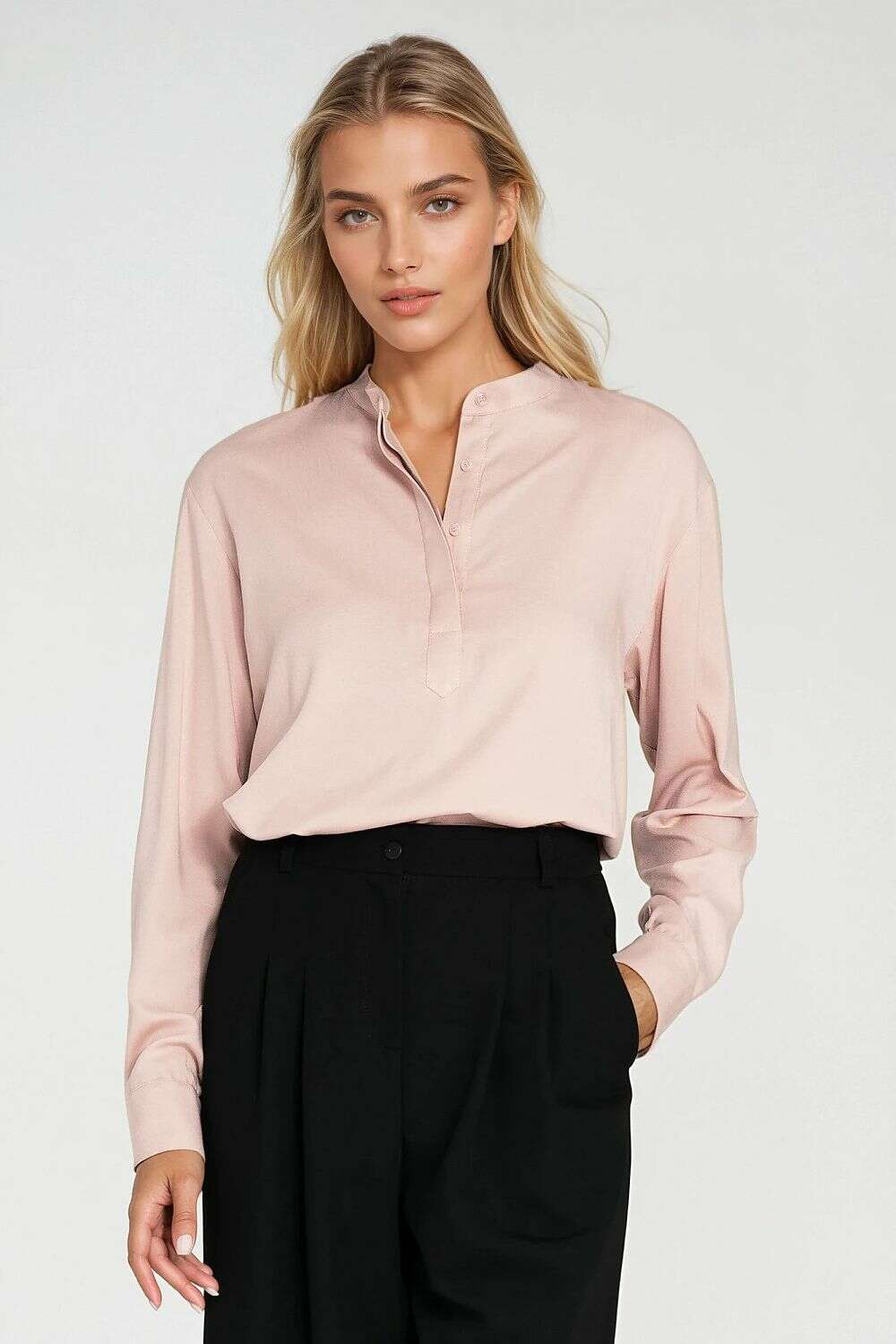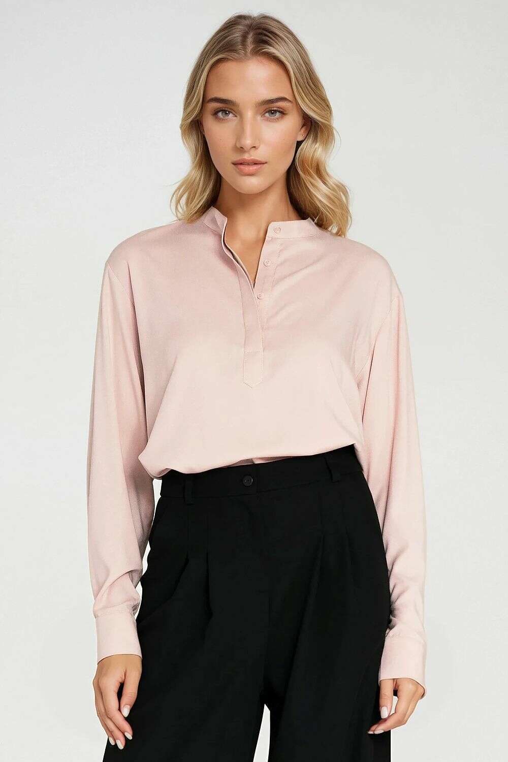 - Design: Polo neckline with a stand-up collar, long sleeves finished with cuffs, and a minimalist covered placket for a clean, classic line.