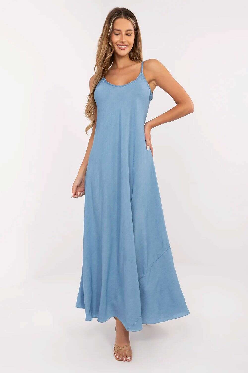 Meet Daydress model 214297 — a blue denim maxi dress with straps that delivers light, stylish everyday wear for warmer days. Crafted with a thin denim blend and a dominant Lyocell component, it offers a soft touch, exceptional breathability, and natural wearing comfort.