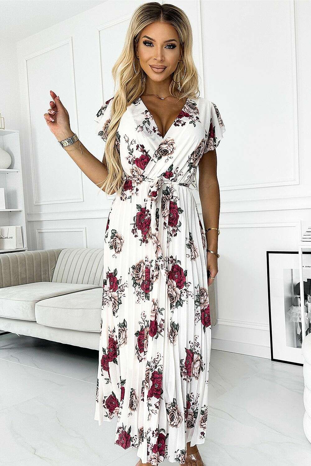 Indulge in a world of elegance and charm with the Burgundy Floral Ruffle Midi Dress by Numoco. This stunning piece is more than just clothing; it’s a captivating statement for any special occasion.
