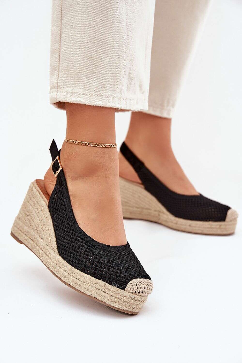 Women's sandals made of textile material are an ideal proposal for warm days. Set on a wedge with a braid, they add subtle height, providing stability and comfort at the same time. Covered toes. The soft insole ensures comfort all day long. Fastened with a buckle with an adjustable strap. Excellent for summer stylizations, combining functionality with a fashionable look, making them a great choice for everyday outings.
