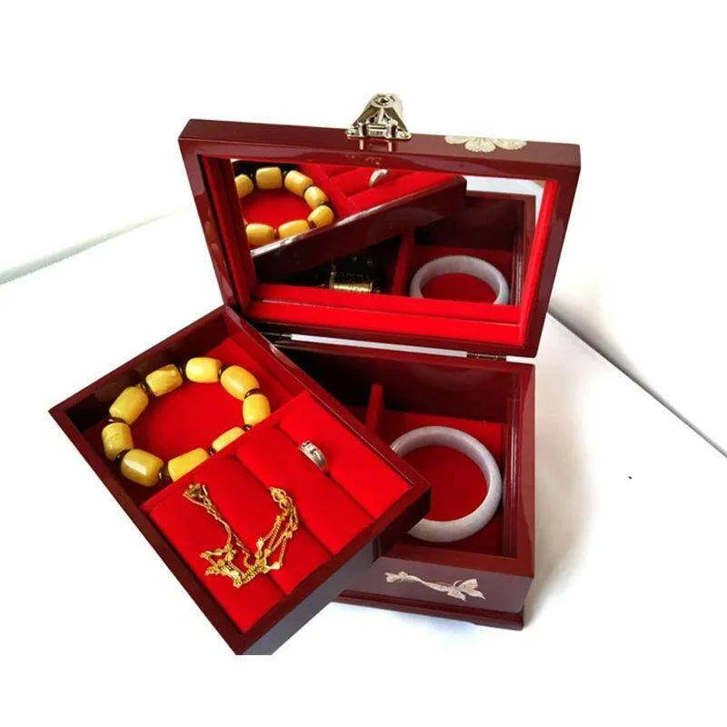- Luxurious Interior: The interior is luxuriously lined with soft red felt, ensuring your precious jewelry is protected while adding an element of sophistication. A mirror inside the lid enhances both beauty and functionality.