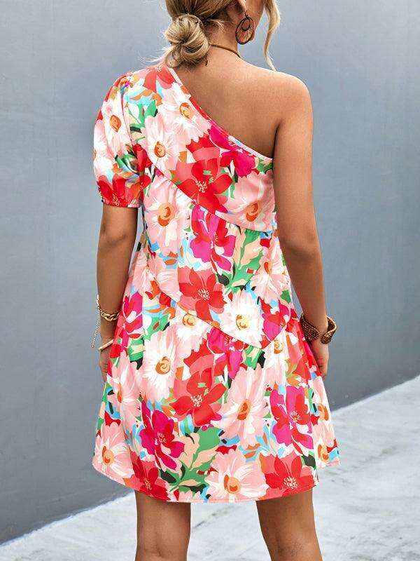 Step into sophistication and make a statement with the Elegant Diagonal One-Shoulder Floral Dress. This exquisite dress is designed to offer a unique blend of beauty and modern style, setting itself apart from ordinary floral dresses.