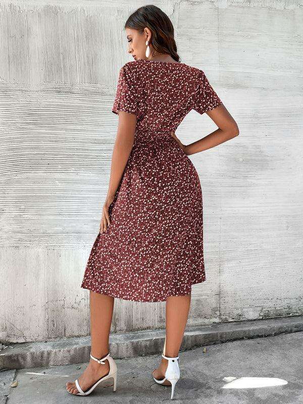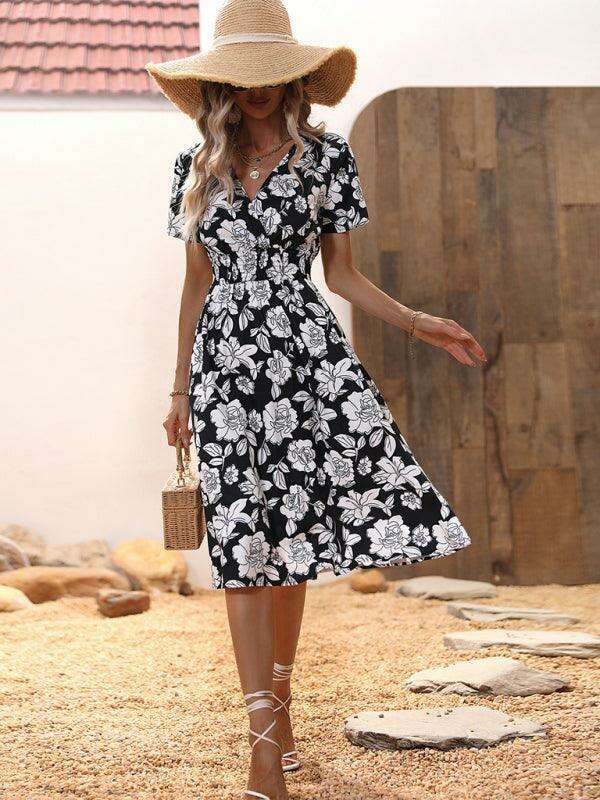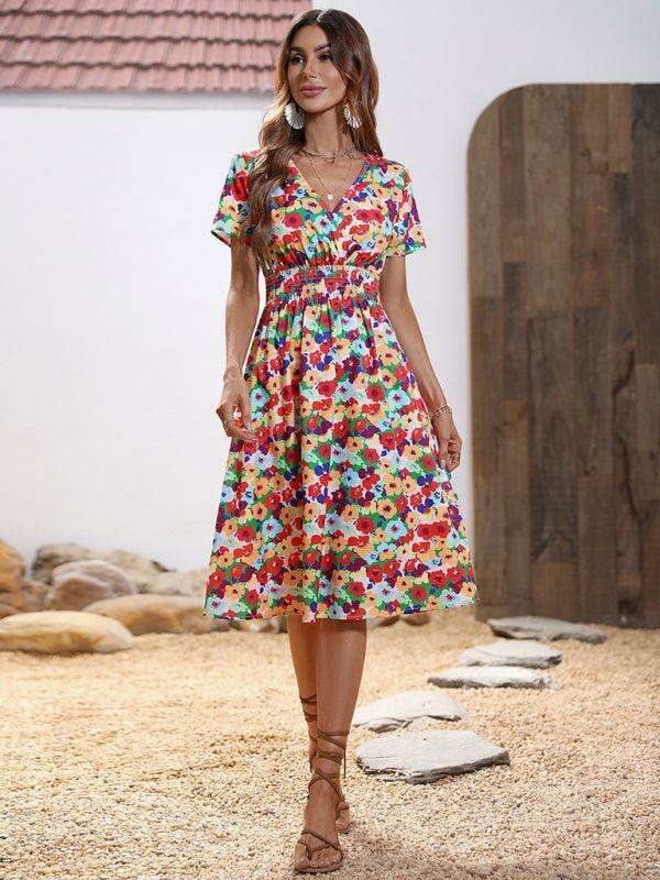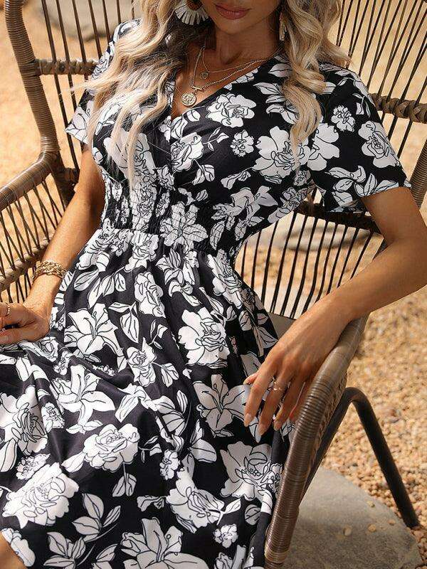 This elegant casual vacation V-neck floral print short-sleeved dress is meticulously designed to keep you cool and stylish. Its flattering silhouette and lightweight fabric make it the perfect companion for your summer adventures, from leisurely beach outings to lively garden parties.