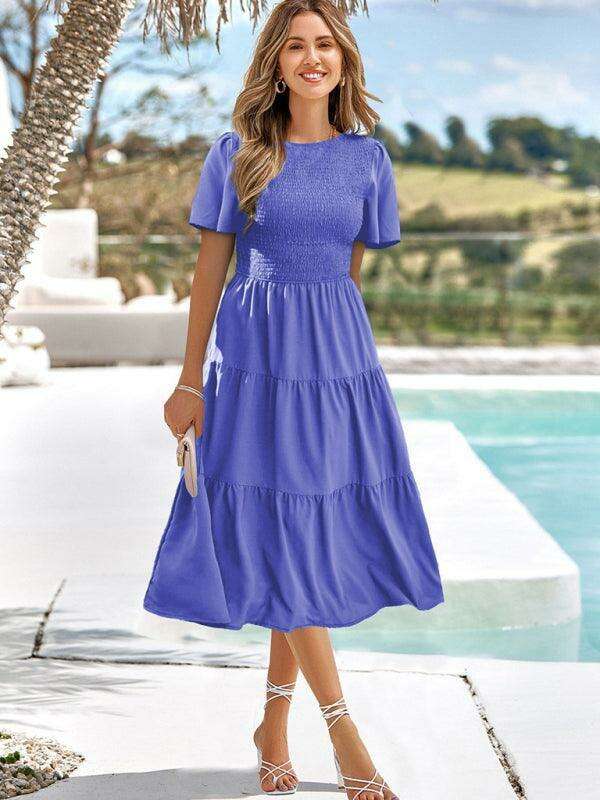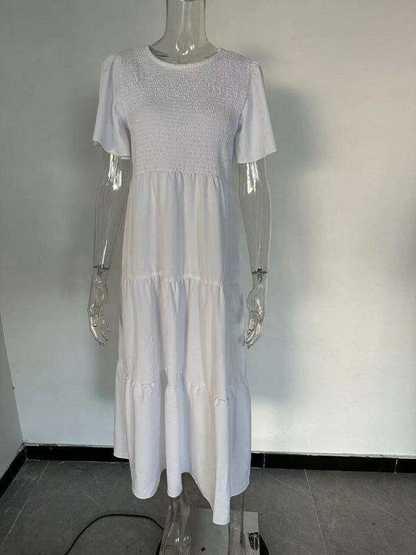 The blend of a classic round neck with elegant pleated details brings a touch of sophistication to your wardrobe. Pair this dress with your favorite accessories to create a chic resort look, or keep it casual with sneakers for a laid-back vibe.