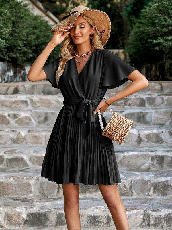 Elegant V-neck Flared Sleeve Dress with Pleated Waist - Stylish Women's Attire