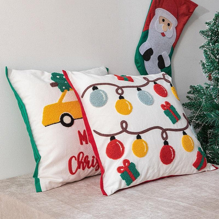 Embroidered Santa & Snowflake Cotton Pillow Cover - Festive Christmas Home Accent