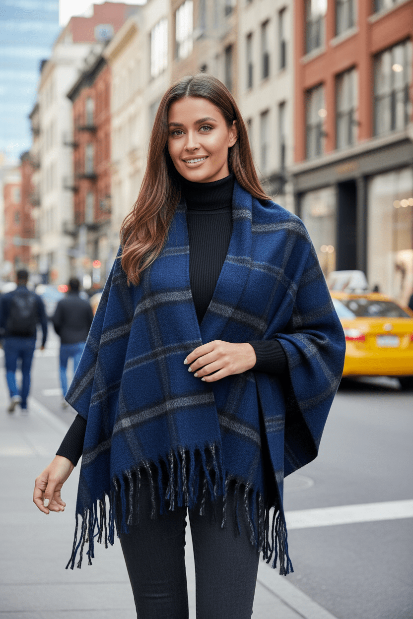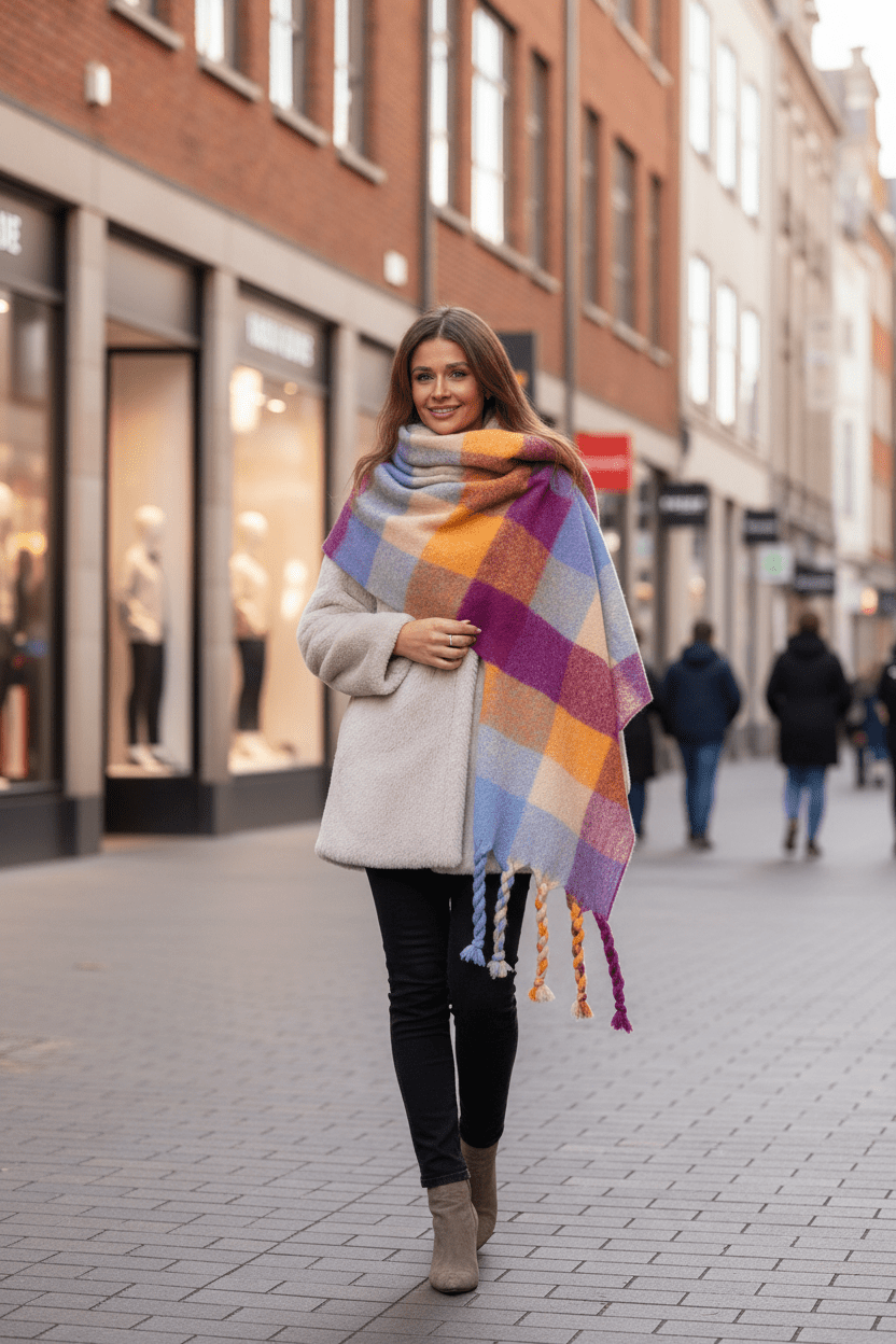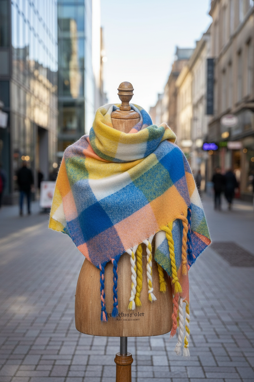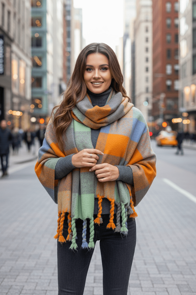 Wrap yourself in this Cozy Colorful Plaid Shawl and enjoy the seamless blend of elegance and coziness, making it an essential piece for your seasonal wardrobe.