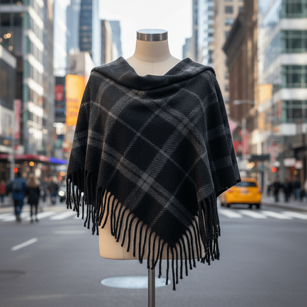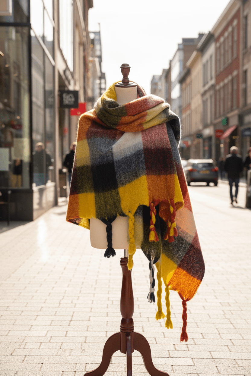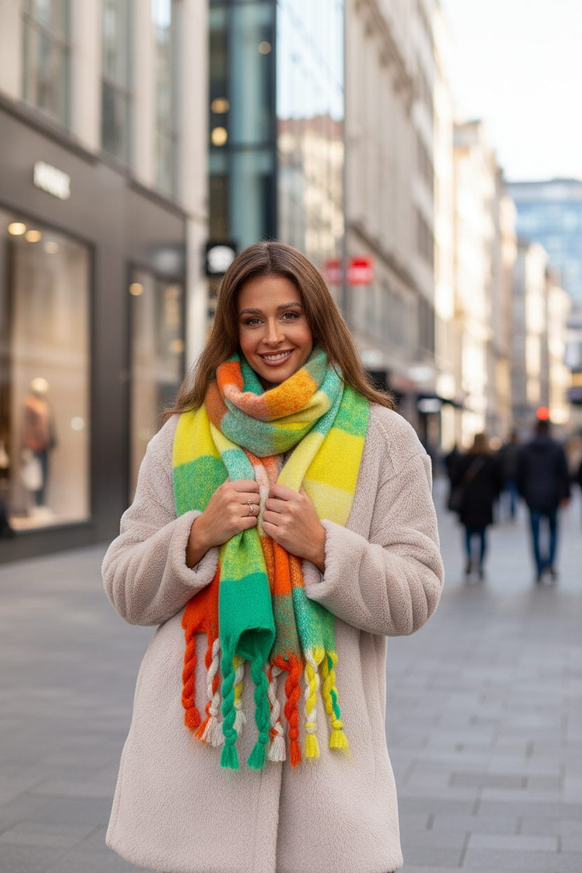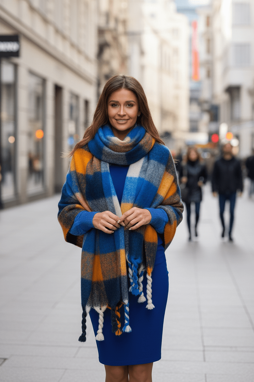 Wrap yourself in this Cozy Colorful Plaid Shawl and enjoy the seamless blend of elegance and coziness, making it an essential piece for your seasonal wardrobe.