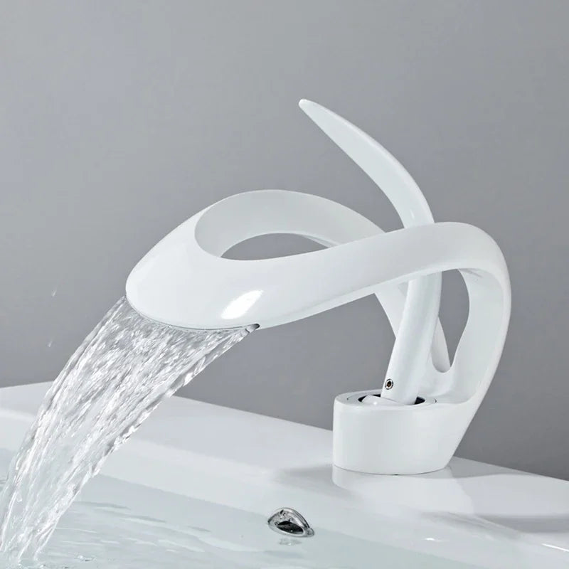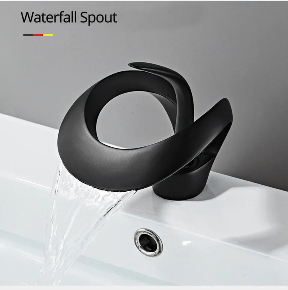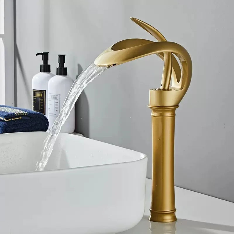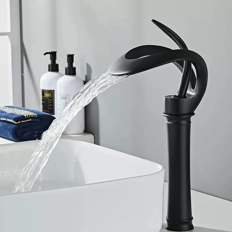 Elevate your bathroom's aesthetic with the Matte Gold and Black Waterfall Bathroom Basin Faucet. This modern brass vanity sink mixer tap combines style and functionality, offering a luxurious touch to your space while efficiently delivering hot and cold water. Designed with a high arc and a stunning waterfall spout, this faucet not only enhances your bathroom's décor but also provides an exceptional user experience.