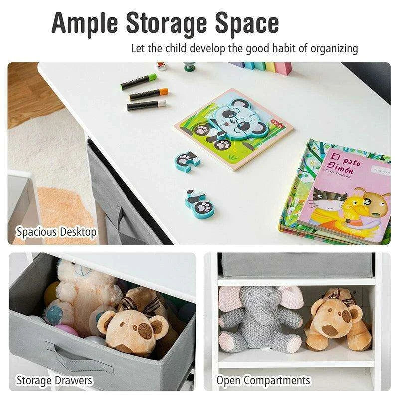This Kids' Educational Activity Table and Chair Set is perfect for children to engage in various activities while providing ample storage for toys and supplies. It fosters creativity, learning, and essential organization skills, making it an invaluable addition to your child's play area.