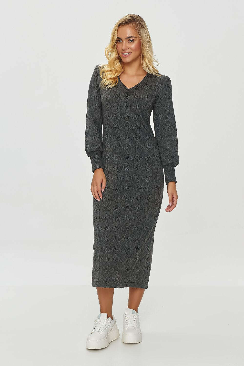 This dress is a perfect example of elegance combined with comfort. The model has a simple, slightly fitted midi length cut that emphasizes the silhouette, while providing comfort at the same time. The subtle slit at the back of the dress does not restrict movement. It is made of soft, stretchy sweatshirt material that fits well on the body, making it perfect for many occasions. The neckline is finished with a V-shaped ribbing, adding subtle elegance to the dress and delicately slimming the neck. The long sleeves are finished with wide ribbing, giving the entire outfit a classic look. The sleeves feature light puffs at the shoulders, adding a modern touch to the dress. Such a creation is perfect for everyday outings, meetings with friends, or even for work, where there is an informal dress code. Additionally, the model combines classic style with a touch of modernity, making it a versatile wardrobe item.