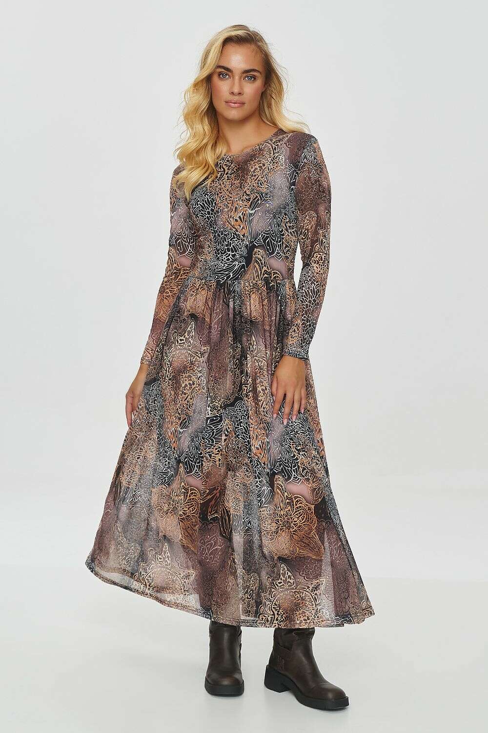 A long printed dress made of light, flowing material, giving it an elegant and romantic look. The dress pattern is a complex mixture of plant, animal, and abstract motifs, with dominant colors of black, white, beige, brown, and shades of orange. The pattern is intricate and original, adding a distinctive style to the creation. The model has a slightly fitted top that accentuates the waist, while the bottom is flared, adding lightness and movement. The finishing of the dress is subtle, and the material is semi-transparent, emphasizing its delicacy. The dress has a viscose lining that discreetly covers strategic areas and ensures comfort while wearing it. When combined with ankle boots, it creates a contrast with the delicacy of the dress, giving the whole outfit a slightly more casual look. The dress is perfect for autumn or winter evenings, thanks to its warm colors and long sleeves. The creation is available in five variants, differing in color and pattern.