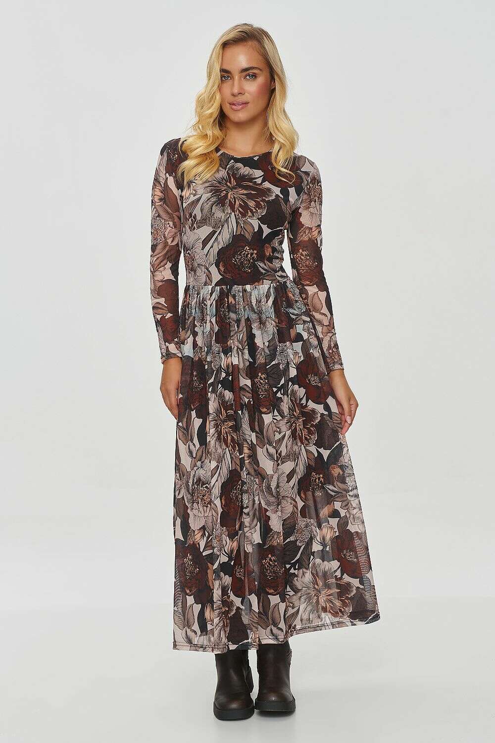 A long printed dress made of light, flowing material, giving it an elegant and romantic look. The dress pattern is a complex mixture of plant, animal, and abstract motifs, with dominant colors of black, white, beige, brown, and shades of orange. The pattern is intricate and original, adding a distinctive style to the creation. The model has a slightly fitted top that accentuates the waist, while the bottom is flared, adding lightness and movement. The finishing of the dress is subtle, and the material is semi-transparent, emphasizing its delicacy. The dress has a viscose lining that discreetly covers strategic areas and ensures comfort while wearing it. When combined with ankle boots, it creates a contrast with the delicacy of the dress, giving the whole outfit a slightly more casual look. The dress is perfect for autumn or winter evenings, thanks to its warm colors and long sleeves. The creation is available in five variants, differing in color and pattern.