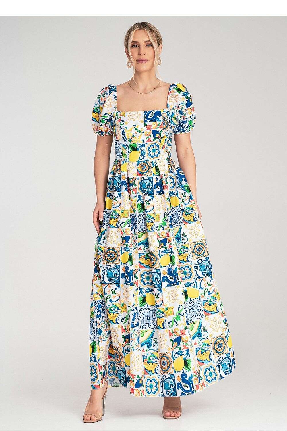 Maxi dress with short, puffy sleeves and a square neckline. Fitted top, cinched at the waist, with a wide, gathered bottom. Smooth fabric, covered with a striking, colorful pattern in the style of ceramic tiles.