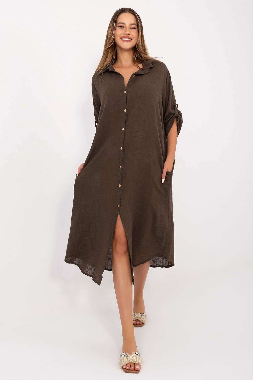 The summer oversized shirt dress is the perfect choice for everyday stylizations. Made of breathable, natural cotton, it ensures comfort even on warmer days. The midi length model features a classic collar and button closure along the entire length. 3/4 sleeves with the option of rolling up increase functionality and allow you to adjust the dress to different temperatures. The smooth material and loose fit give it a versatile character, while the hidden slip pockets in the side seams are a practical detail that emphasizes the everyday, casual style of this dress.