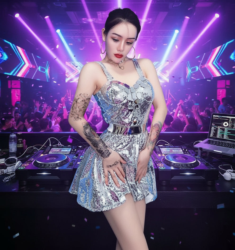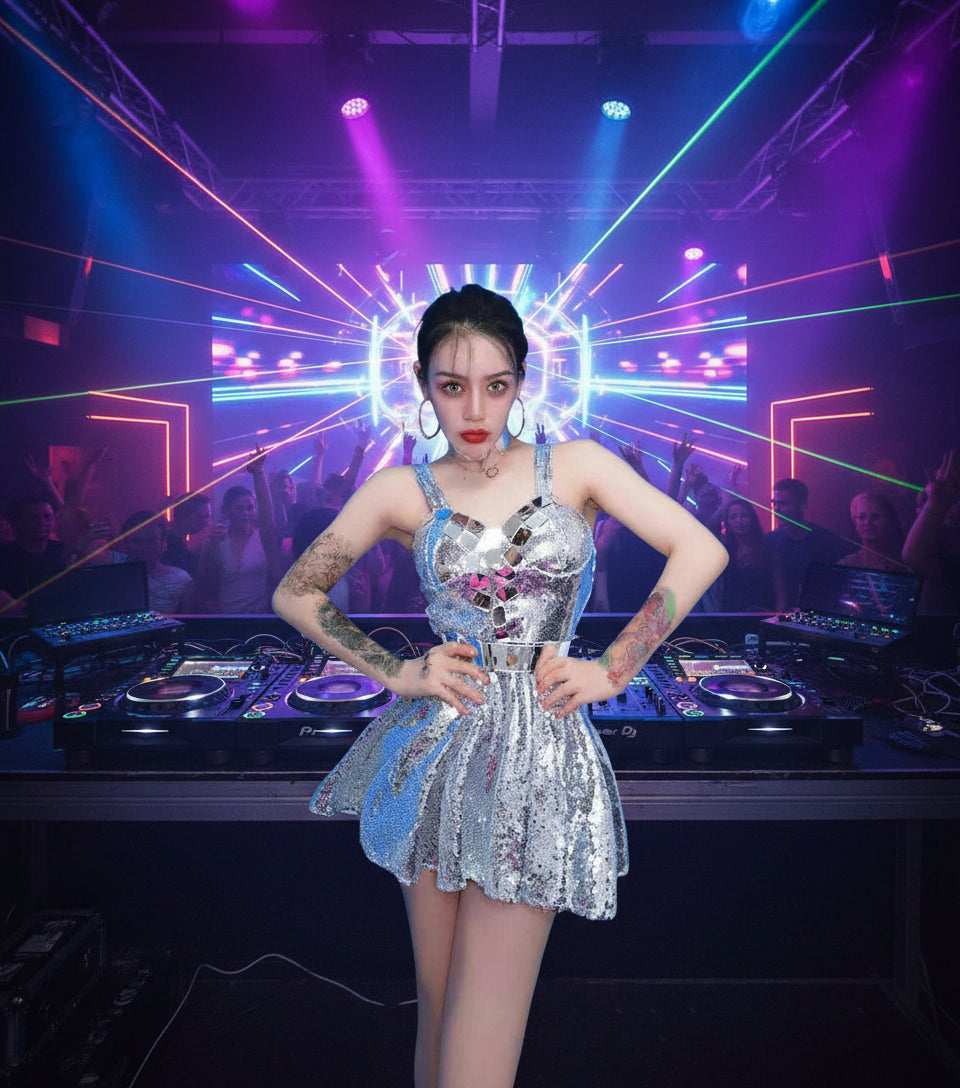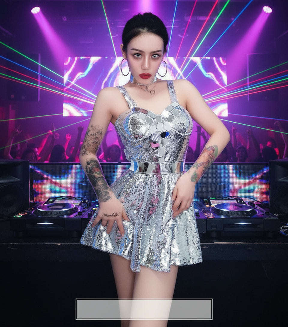 • Reflective Elegance: Adorned with shimmering silver sequins and mirrors, this dress captures and reflects light, creating a mesmerizing sparkle that is sure to turn heads.