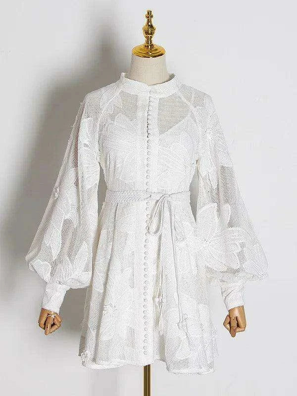 Elegant A-line Lantern Sleeve Dress with French Embroidery and Adjustable Lace-Up - SHENGPALAEF Summer 2024 Collection