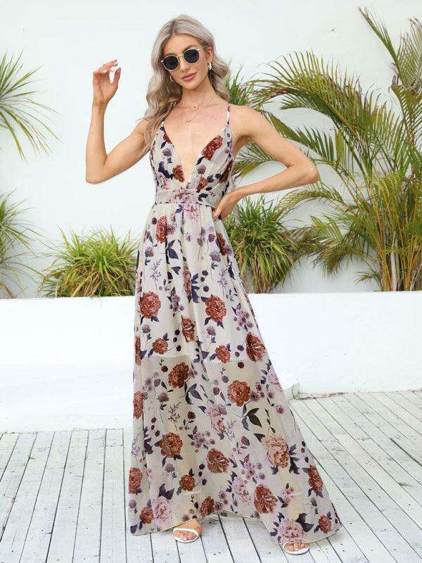 Elegant Boho V-Neck Maxi Dress with Stylish Suspender Straps