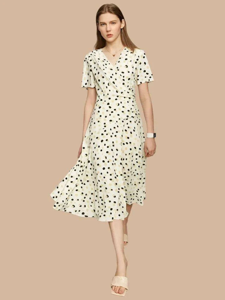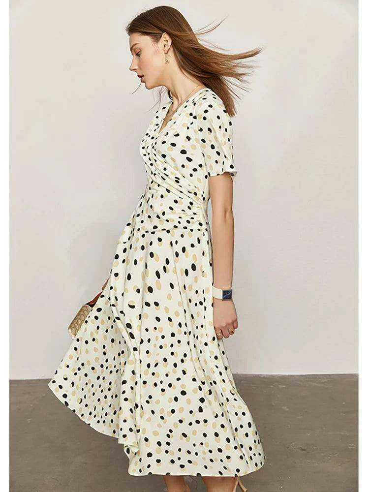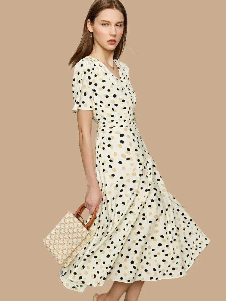 Chic Dot Print V-Neck Slim Fit Midi Dress for Women – Elegant Summer A-Line Chiffon Dress in White