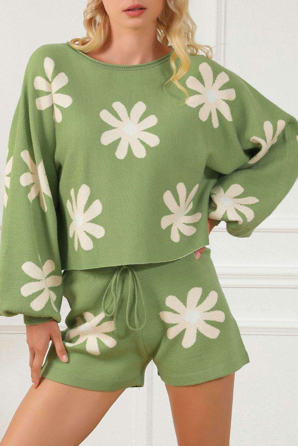 Chic Floral Two-Piece Sweater and Shorts Ensemble with Trendy Bubble Sleeves