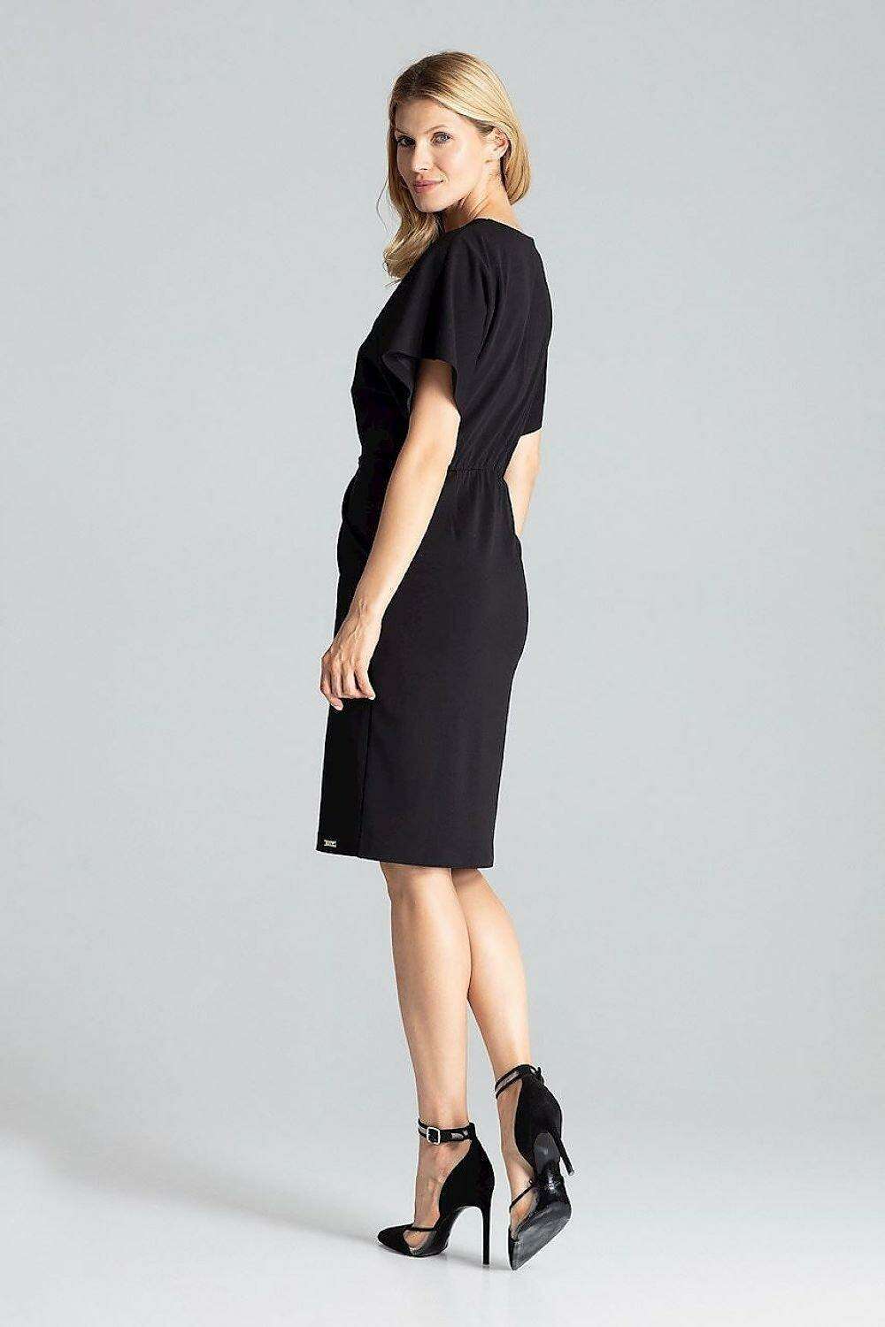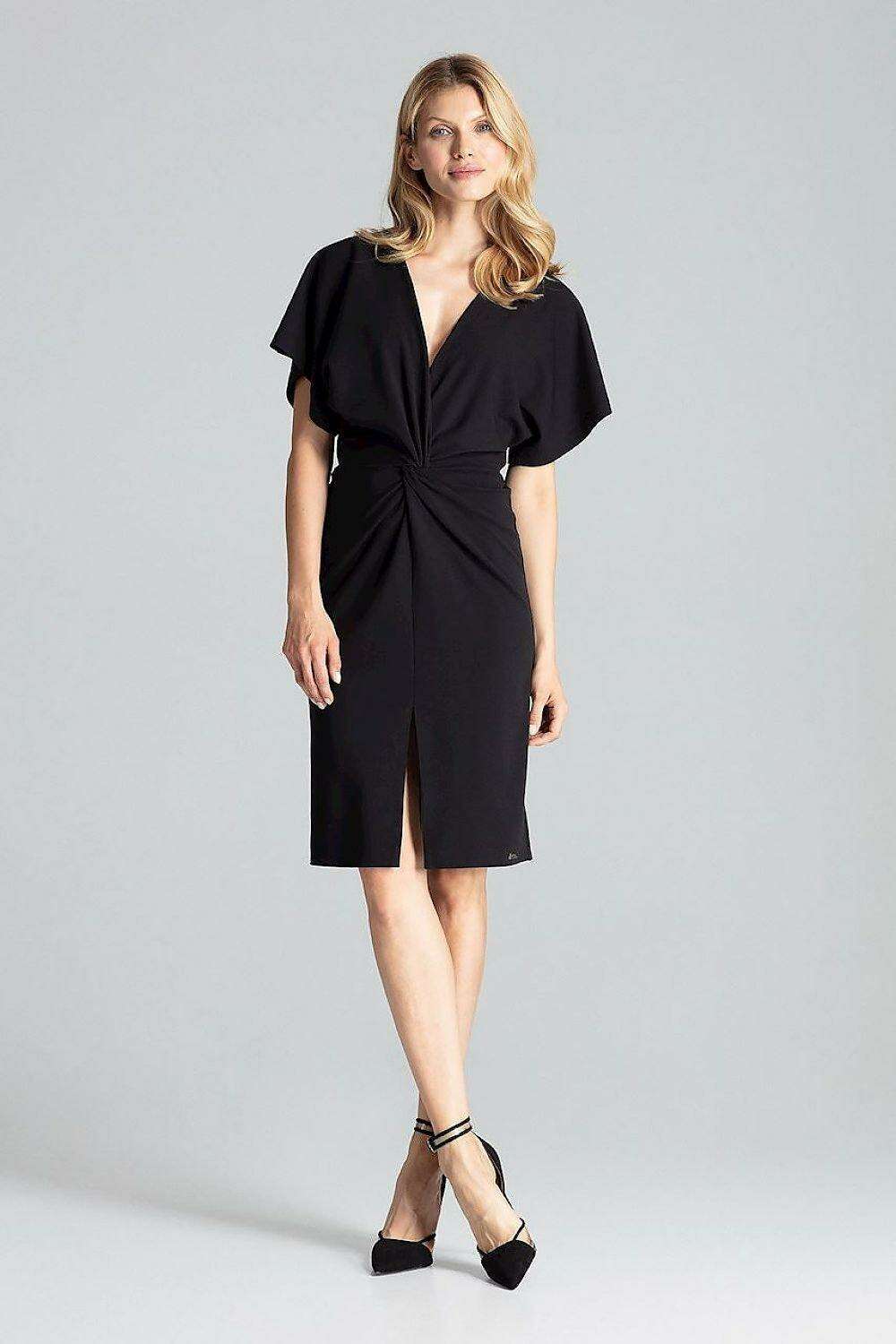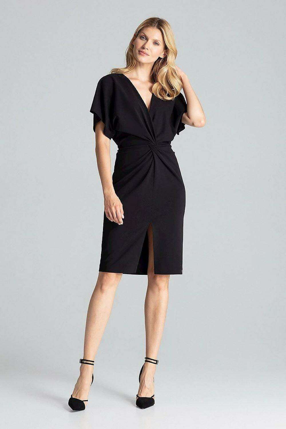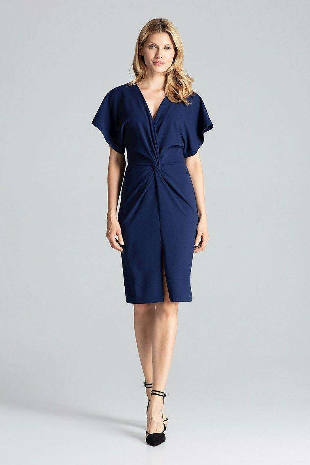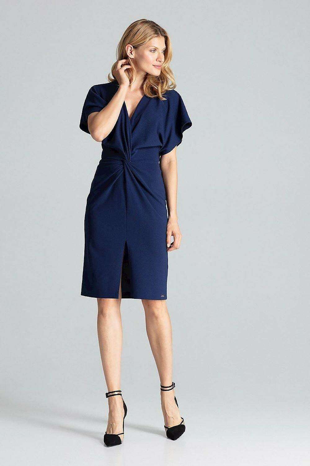 Elegant Navy Blue Midi Dress with Kimono Sleeves and Alluring Envelope Neckline