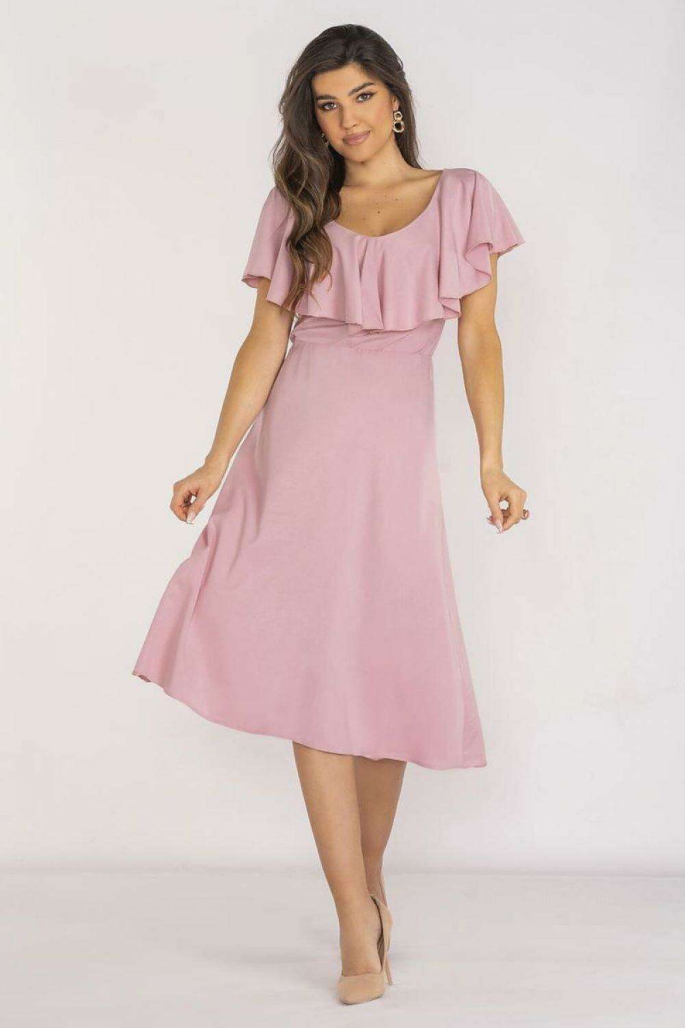 Chic Midi Dress with Ruffled Neckline and Adjustable Waist