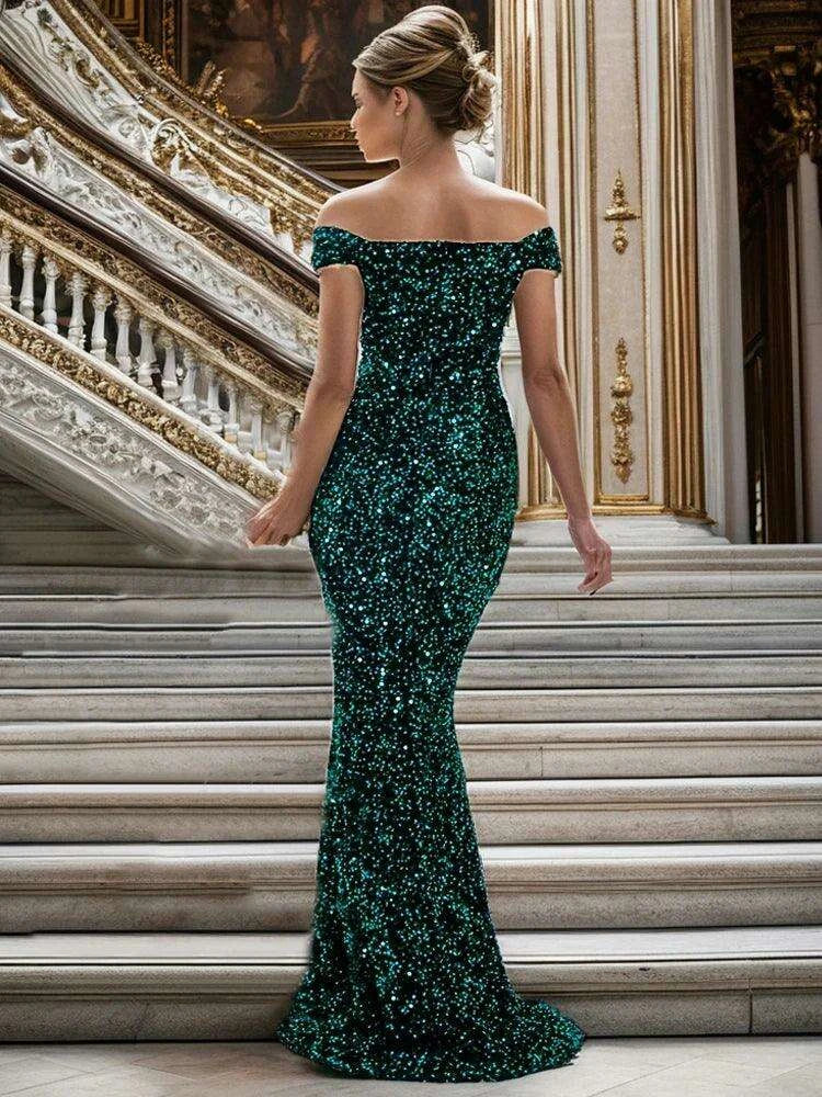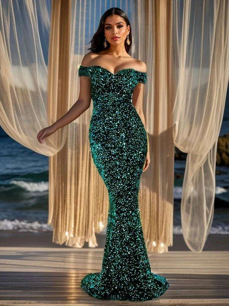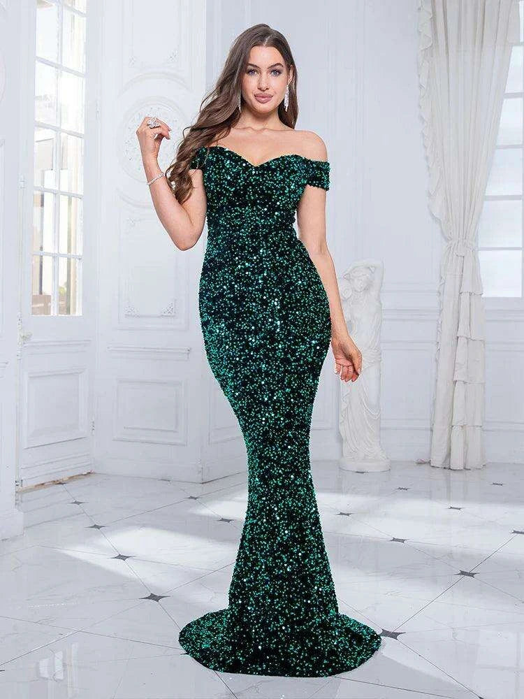 Elevate your evening elegance with the Glamorous Off-The-Shoulder Sequin Velvet Mermaid Evening Gown - Luxurious Long Dress for Women in Vibrant Red. This stunning gown is crafted for those who desire to make a statement at any special event, from weddings to galas. The exquisite design combines glamour and sophistication, ensuring you stand out in the crowd.
