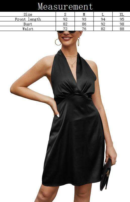 Elevate your style with the Glamorous Spring V-neck Satin Backless Dress, meticulously crafted for the modern woman who seeks elegance and charm. This exquisite dress melds a chic backless design with a flattering V-neck collar, making it the ultimate choice for formal events and captivating nights out.