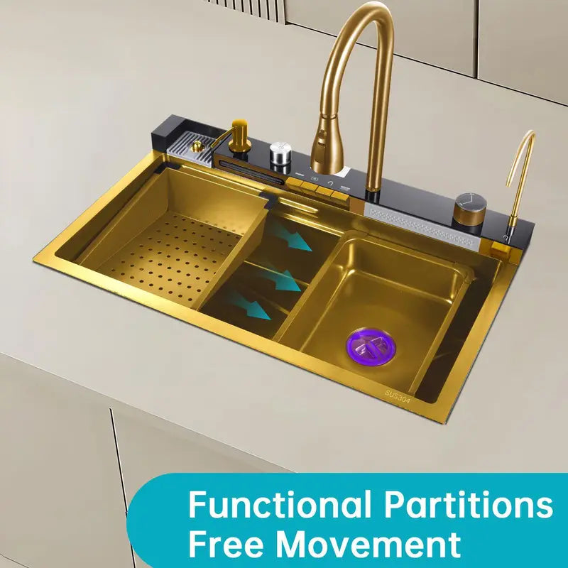 Gold Kitchen Workstation Sink, Waterfall Faucet, Undermount De