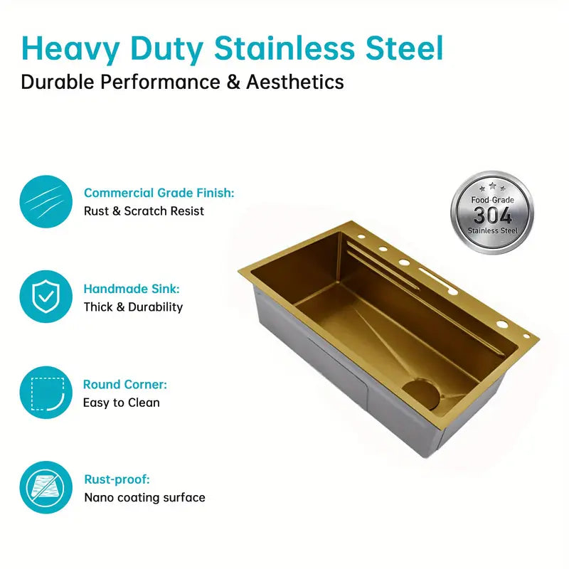 The Gold Kitchen Workstation Sink is the ultimate solution for modern kitchens, combining style, functionality, and advanced features in one comprehensive package. Crafted from high-quality 304 grade stainless steel, this sink is designed to withstand the rigors of daily use while maintaining its elegant appearance. Its innovative design not only enhances your kitchen aesthetics but also improves efficiency, making it a must-have for any culinary enthusiast.