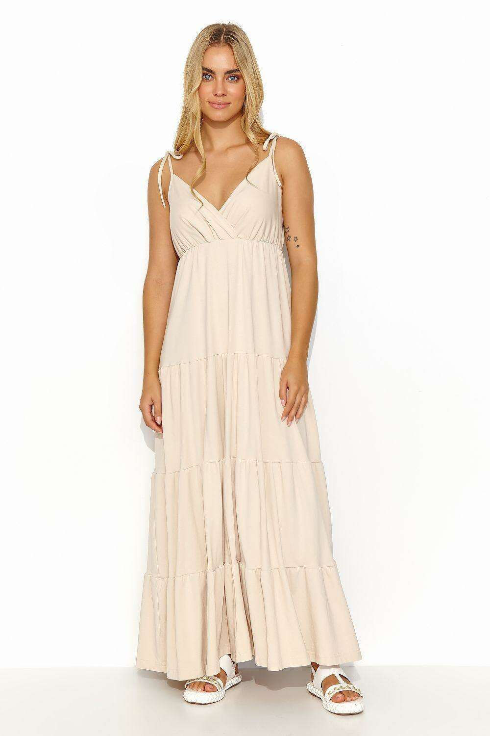 Experience the epitome of elegance and femininity with the Golden Sunlight Romance Maxi Gown. This long summer dress is designed to captivate and enchant, featuring segments that mimic subtle ruffles for a delightful touch of romance.