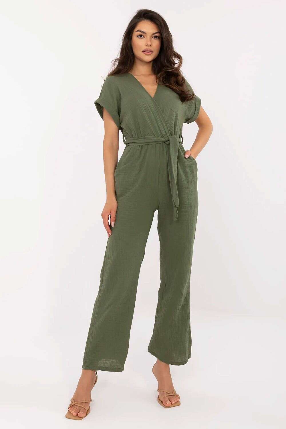 Green Cotton Jumpsuit Short Sleeve Wrap Neck Day Comfort