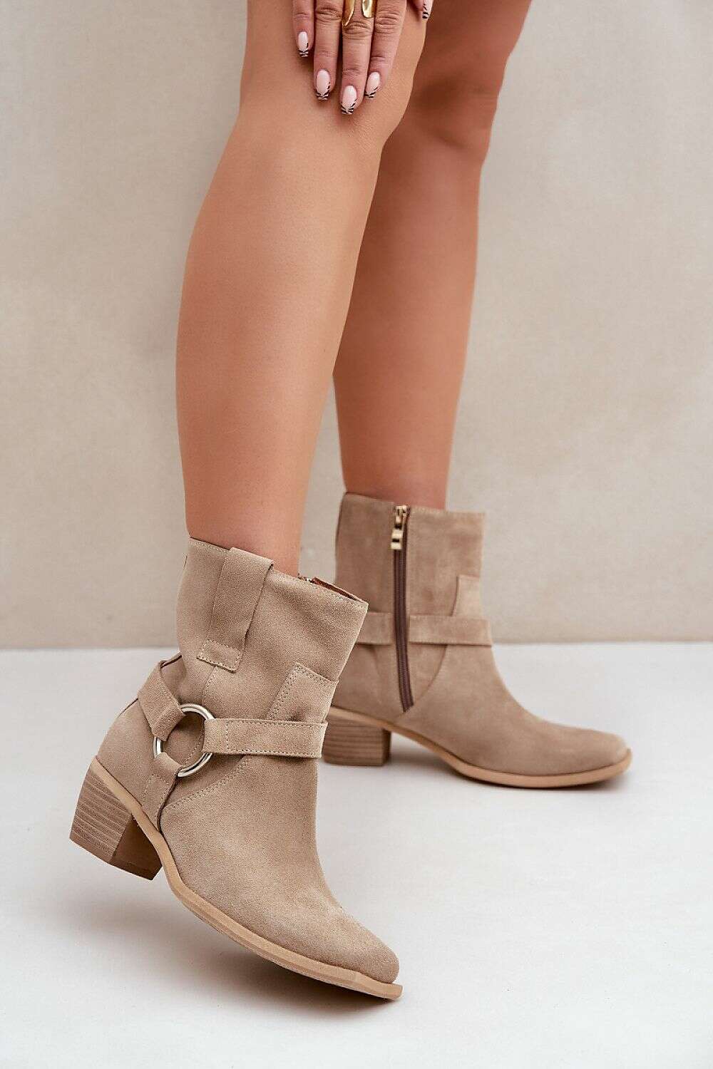 Women's boots made of natural suede are a stylish model, ideal for colder days. Set on a stable stiletto heel, they provide comfort and subtly elongate the silhouette. They are zippered for easy donning, and the rounded toe with a square sole gives them a modern touch. The upper is decorated with decorative stripes, which adds elegance and attracts the eye. These unique boots are perfect for both casual and more formal outfits, combining comfort with fashionable design.
