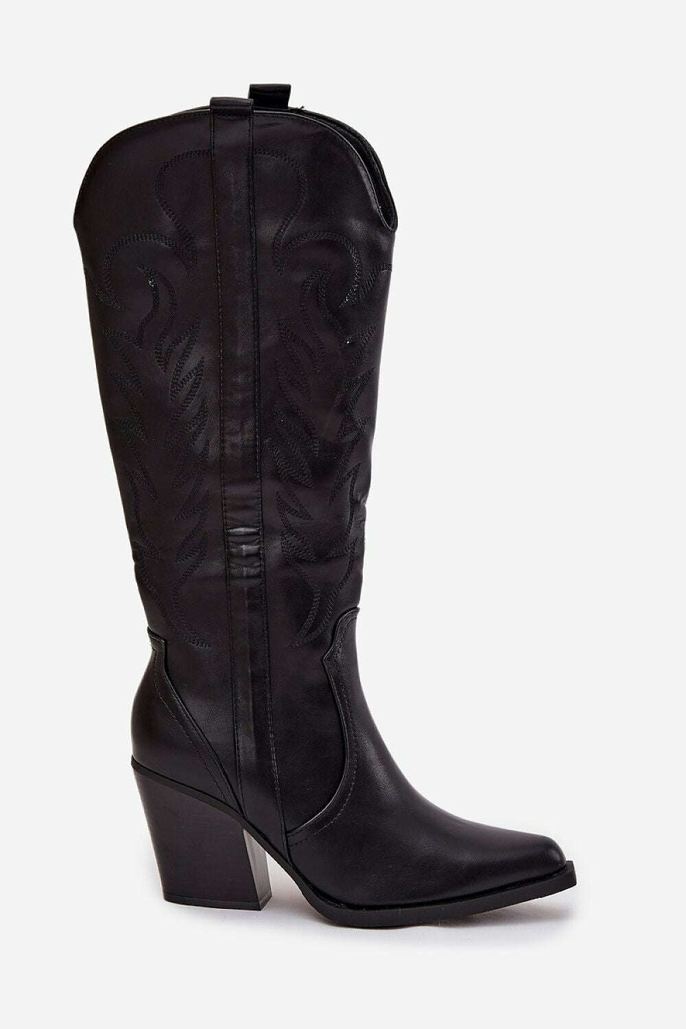 The design features a stable cut-out column heel that adds height and a distinctive silhouette, while making walking feel effortless. A sharp, pointed toe visually lengthens the legs, and decorative stitching along the shaft delivers a unique, artisanal touch. The boots are easy to slip on thanks to a convenient zipper along with the pull-on fit.