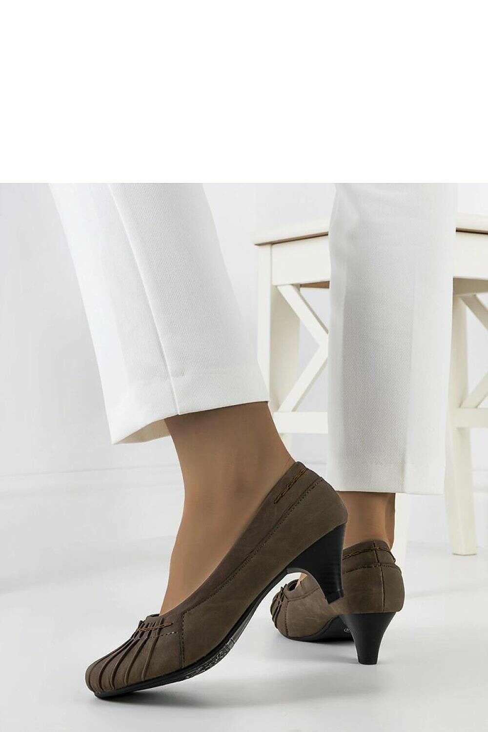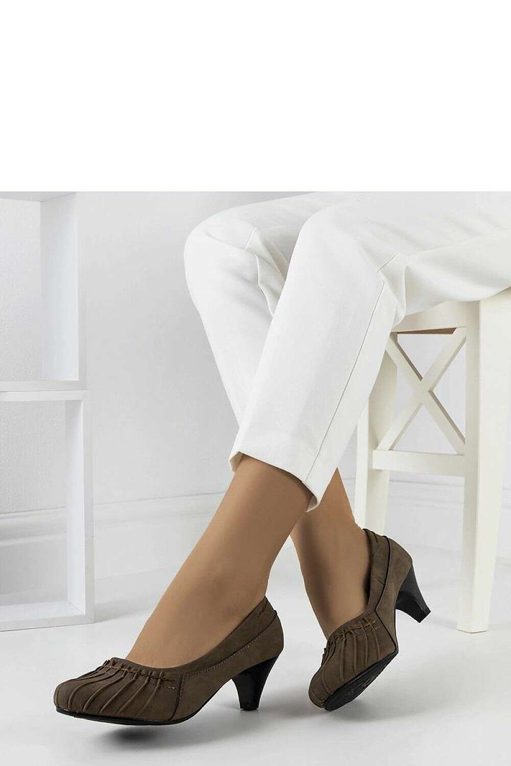 Elegant brown pumps with ruching Santro are the perfect choice for a business styling. Made of high-quality eco-leather, they have a rounded toe that will slim down the foot. Set on a low heel, they provide comfort and stability when worn. An interesting detail in the form of ruching on the front of the upper adds originality to them. Standard numbering, so it is worth suggesting your size when buying. Excellent pumps on a post that will work well both in the office and during meetings or ceremonies. The whole is complemented by a black sole made of plastic, which adds elegance to every styling. Perfect for the upcoming summer!