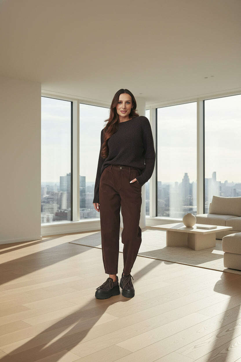 The high waist and slim tapered cut subtly cinch the waist for a flattering silhouette, while classic pockets and a metal button add character. The warm brown shade pairs perfectly with beige, black, and caramel, making them an ideal choice for autumn and winter wardrobes.