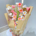 Indulge in the allure of enchanting elegance with our Delightful Handcrafted Milk Cotton Flower Arrangement. This exquisite bouquet showcases a harmonious blend of tulips, daisies, and bellflowers, designed to elevate your space with a touch of nature's beauty.