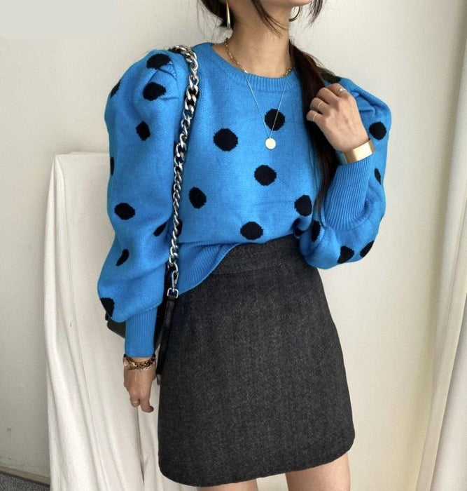 Korean-Inspired Sweater with Polka Dot Puff Sleeves - Fashionably Cozy and Elegant