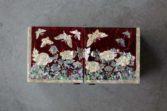 Discover the exquisite Korean Red Butterfly & Peony Hanji Najeon Lacquerware Jewelry Box, where timeless tradition meets modern elegance. Handcrafted with unparalleled attention to detail, this stunning piece is ideal for safeguarding your most cherished treasures.