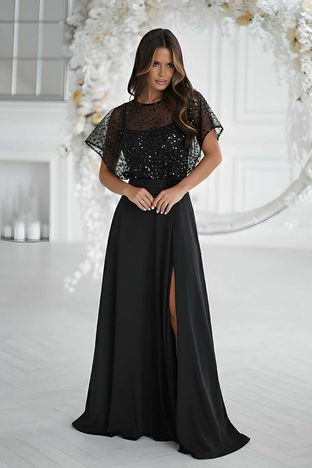 The standout feature is the sparkling sequin bolero, paired with a delicate rose motif on the belt. This unique combination adds drama and romance to your ensemble, perfect for formal events, weddings, galas, and evening outings.