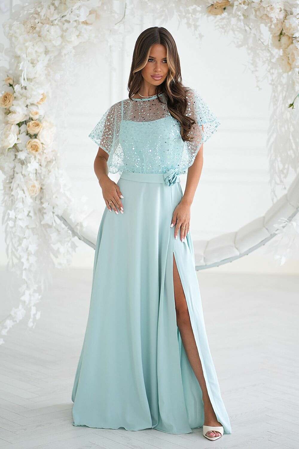 Step into the night with this Long Evening Dress With Sequin Bolero And Rose Belt, a perfect fusion of sleek sophistication and radiant sparkle. The dress features slender, delicate straps and a lightweight silhouette that moves with you, while a shimmering sequin bolero adds instant glamour. A rose-detail belt provides a romantic focal point for a look that’s chic, modern, and unforgettable.